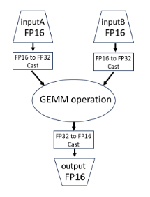 For the IMatrixMultiplyLayer, TensorRT, by default, selects accumulation precision based on the input types and performance considerations. However, the accumulation type is guaranteed to have a range at least as great as the input types. When using strongly typed mode, you can enforce FP32 precision for FP16 GEMMs by casting the inputs to FP32. TensorRT recognizes this pattern and fuses the casts with the GEMM, resulting in a single kernel with FP16 inputs and FP32 accumulation.
