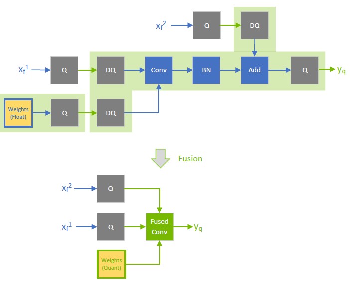 In contrast, when \(x_{f^{}}^{1}\) is quantized to INT8, as depicted in the following diagram, the output of the fused convolution is also INT8, and the trailing Q-layer is fused with the convolution.