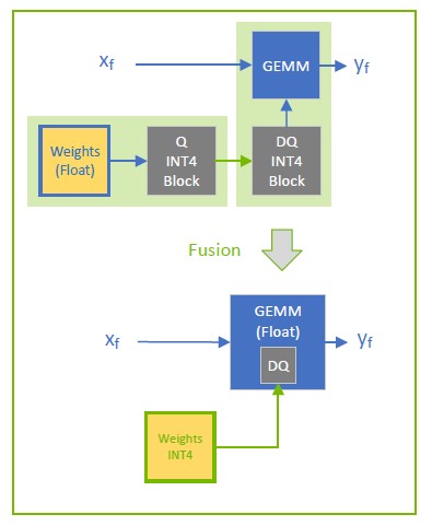 INT4 block quantization supports weight-only quantization (WoQ).