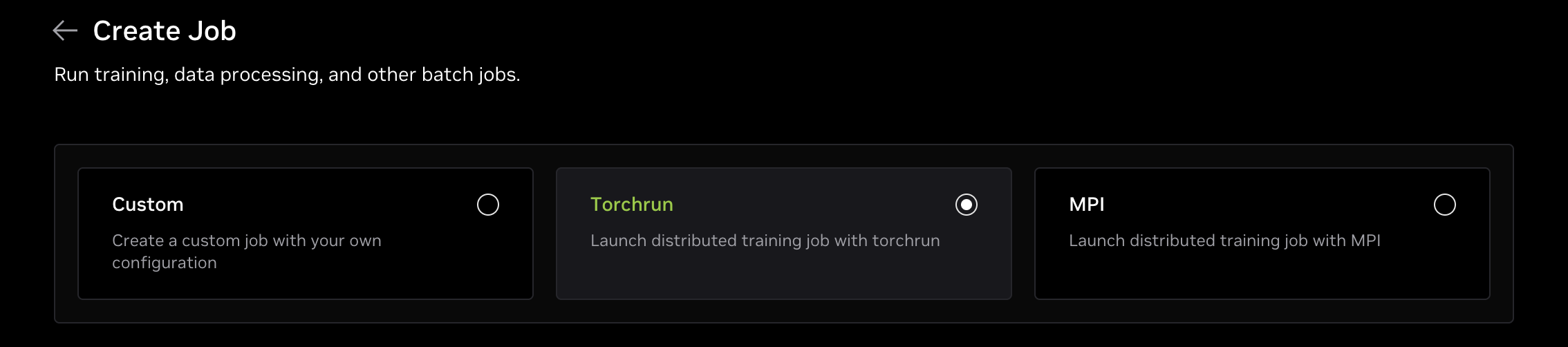 In the container section, use the image (nvcr.io/nvidia/pytorch:25.08-py3) and paste the following command as the Torchrun Command to run the job:
