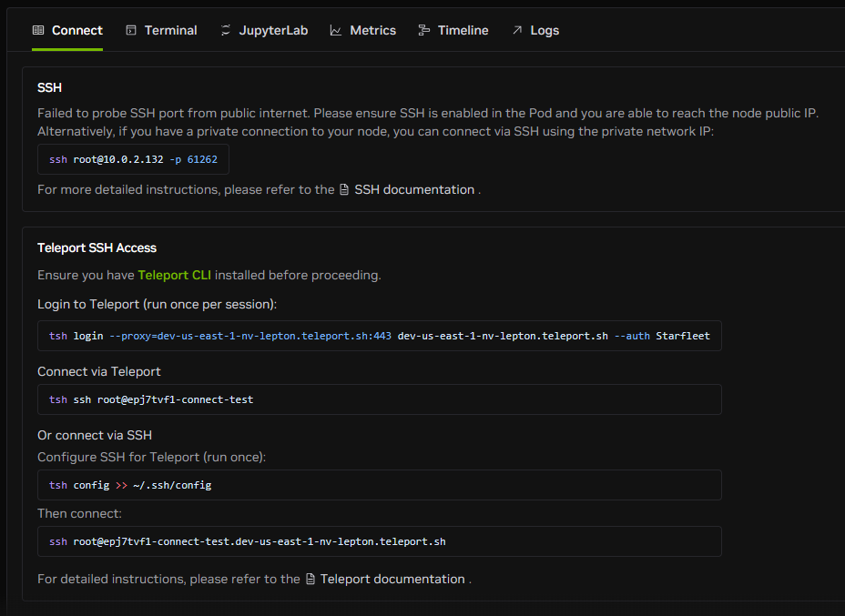 Once Teleport support is enabled in your Lepton workspace and node group(s), dev pods running within the node group(s) will display the following Teleport SSH Access information under the Connect tab: