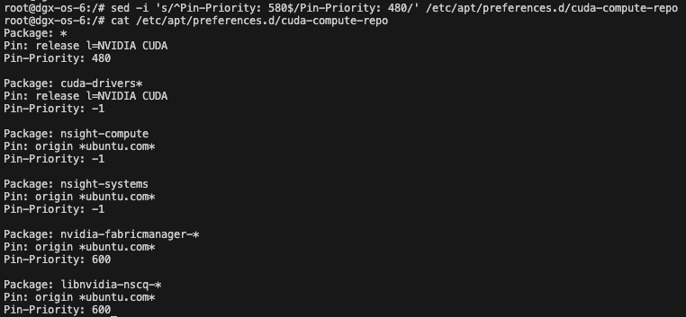 Change the CUDA repo preferences from the default of 580 to 480 as the newly added repo will have the default value of 500. Otherwise, the MFT package will install at an earlier version which is incompatible with the DOCA driver. This will be changed to default after the install procedure is completed.