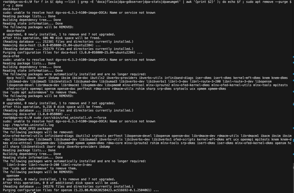 root@dgx-os-6:/# dpkg --list datacenter-gpu-manager &> /dev/null && apt purge --yes datacenter-gpu-manager root@dgx-os-6:/# dpkg --list datacenter-gpu-manager-config &> /dev/null && apt purge --yes datacenter-gpu-manager-config