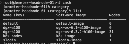 root@demeter-headnode-01:~# cmsh -c 'softwareimage list' Name (key) Path (key) Kernel version Nodes ---------------------- ---------------------------------------- ------------------- -------- default-image /cm/images/default-image 5.19.0-45-generic 0 dgx-os-6.1-a100-image /cm/images/dgx-os-6.1-a100-image 5.15.0-1042-nvidia 0 dgx-os-6.1-h100-image /cm/images/dgx-os-6.1-h100-image 5.15.0-1042-nvidia 31 k8s-image /cm/images/k8s-image 5.19.0-45-generic 0