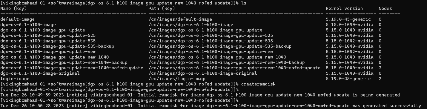 root@demeter-headnode-01:~# cmsh [demeter-headnode-01]% softwareimage [demeter-headnode-01->softwareimage]% use dgx-os-6.3.2-h100-image [demeter-headnode-01->softwareimage[dgx-os-6.3.2-h100-image]]% set kernelversion 5.15.0-1078-nvidia [demeter-headnode-01->softwareimage*[dgx-os-6.3.2-h100-image*]]% commit Sun Jun 1 22:15:28 2025 [notice] demeter-headnode-01: Initial ramdisk for image dgx-os-6.3.2-h100-image is being generated Sun Jun 1 22:16:15 2025 [notice] demeter-headnode-01: Initial ramdisk for image dgx-os-6.3.2-h100-image was generated successfully