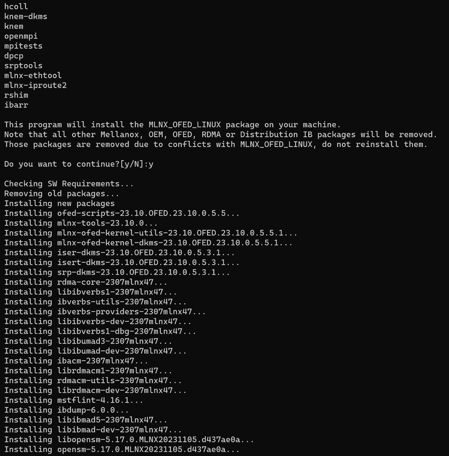 root@demeter-headnode-01:~# /cm/local/apps/mlnx-ofed24.10/current/bin/mlnx-ofed24.10-install.sh -s dgx-os-6.3.2-h100-image Mellanox OFED installation, version: 24.10-2.1.8.0 for x86_64. On " dgx-os-6.3.2-h100-image " software image, for kernel version: 5.15.0-1078-nvidia. Log file: /var/log/cm-ofed.log Package directory: /cm/local/apps/mlnx-ofed24.10/24.10-2.1.8.0-ubuntu22.04/DEBS/x86_64 removing: dapl2-utils ibacm ibsim-utils ibutils ibverbs-providers ibverbs-providers:amd64 ibverbs-utils infiniband-diags libdapl2 libibdm1 libibmad5 libibmad5:amd64 libibnetdisc5 libibnetdisc5:amd64 libibumad3 libibverbs1 libipathverbs1 libmlx4-1 libmlx5-1 libmthca1 libopensm2 libopensm9 libosmcomp5 libosmvendor5 librdmacm1 librdmacm1:amd64 libumad2sim0 mstflint opensm openvswitch-switch perftest rdmacm-utils rdma-core srptools purging: opensm infiniband-diags infiniband-diags srptools libosmvendor5 infiniband-diags ibacm srptools libdapl2 ibverbs-providers:amd64 ibacm opensm libosmvendor5 opensm libosmvendor5 libopensm9 opensm libdapl2 srptools ibacm purging: rdma-core Package directory: /cm/local/apps/mlnx-ofed24.10/24.10-2.1.8.0-ubuntu22.04/DEBS/x86_64 installing: /cm/local/apps/mlnx-ofed24.10/24.10-2.1.8.0-ubuntu22.04/DEBS/x86_64/ofed-scripts_24.10.OFED.24.10.2.1.8-1_amd64.deb installing: /cm/local/apps/mlnx-ofed24.10/24.10-2.1.8.0-ubuntu22.04/DEBS/x86_64/mlnx-tools_24.10-0.2410068_amd64.deb installing: /cm/local/apps/mlnx-ofed24.10/24.10-2.1.8.0-ubuntu22.04/DEBS/x86_64/mlnx-ofed-kernel-utils_24.10.OFED.24.10.2.1.8.1-1_amd64.deb installing: /cm/local/apps/mlnx-ofed24.10/24.10-2.1.8.0-ubuntu22.04/DEBS/x86_64/mlnx-ofed-kernel-dkms_24.10.OFED.24.10.2.1.8.1-1_all.deb installing: /cm/local/apps/mlnx-ofed24.10/24.10-2.1.8.0-ubuntu22.04/DEBS/x86_64/iser-dkms_24.10.OFED.24.10.2.1.8.1-1_all.deb installing: /cm/local/apps/mlnx-ofed24.10/24.10-2.1.8.0-ubuntu22.04/DEBS/x86_64/isert-dkms_24.10.OFED.24.10.2.1.8.1-1_all.deb installing: /cm/local/apps/mlnx-ofed24.10/24.10-2.1.8.0-ubuntu22.04/DEBS/x86_64/srp-dkms_24.10.OFED.24.10.2.1.8.1-1_all.deb installing: /cm/local/apps/mlnx-ofed24.10/24.10-2.1.8.0-ubuntu22.04/DEBS/x86_64/mlnx-nfsrdma-dkms_24.10.OFED.24.10.2.1.8.1-1_all.deb installing: /cm/local/apps/mlnx-ofed24.10/24.10-2.1.8.0-ubuntu22.04/DEBS/x86_64/mlnx-nvme-dkms_24.10.OFED.24.10.2.1.8.1-1_all.deb installing: /cm/local/apps/mlnx-ofed24.10/24.10-2.1.8.0-ubuntu22.04/DEBS/x86_64/kernel-mft-dkms_4.30.1.113-1_all.deb installing: /cm/local/apps/mlnx-ofed24.10/24.10-2.1.8.0-ubuntu22.04/DEBS/x86_64/knem-dkms_1.1.4.90mlnx3-OFED.23.10.0.2.1.1_all.deb installing: /cm/local/apps/mlnx-ofed24.10/24.10-2.1.8.0-ubuntu22.04/DEBS/x86_64/xpmem-dkms_2.7.4-1.2410068_all.deb installing: rdma-core:amd64 libibverbs1:amd64 ibverbs-utils:amd64 ibverbs-providers:amd64 libibverbs-dev:amd64 libibverbs1-dbg:amd64 libibumad3:amd64 libibumad-dev:amd64 ibacm:amd64 librdmacm1:amd64 rdmacm-utils:amd64 librdmacm-dev:amd64 ibdump:amd64 libibmad5:amd64 libibmad-dev:amd64 libopensm:amd64 opensm:amd64 opensm-doc:amd64 libopensm-devel:amd64 libibnetdisc5:amd64 infiniband-diags:amd64 mft:amd64 perftest:amd64 ibutils2:amd64 ibsim:amd64 ibsim-doc:all ucx:amd64 sharp:amd64 hcoll:amd64 knem:amd64 openmpi:all mpitests:amd64 xpmem:all libxpmem0:amd64 libxpmem-dev:amd64 dpcp:amd64 srptools:amd64 mlnx-ethtool:amd64 mlnx-iproute2:amd64 rshim:amd64 ibarr:amd64 installing: /cm/local/apps/mlnx-ofed24.10/24.10-2.1.8.0-ubuntu22.04/DEBS/x86_64/mlnx-fw-updater_24.10-2.1.8.0_amd64.deb installing: /cm/local/apps/mlnx-ofed24.10/24.10-2.1.8.0-ubuntu22.04/DEBS/x86_64/mlnx-ofed24.10-modules_24.10.2.1.8.0-100005-cm10.0-574d108822_all.deb Update kernel module dependencies. Enable openibd service. marking package "linux-generic" as held back marking package "linux-headers-generic" as held back marking package "linux-image-generic" as held back Creating ramdisk image. Installed Mellanox OFED stack DEB packages on " dgx-os-6.3.2-h100-image " software image. Done. root@demeter-headnode-01:~#