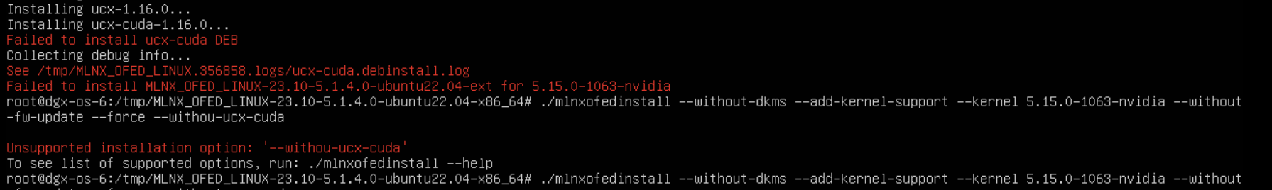 # Clean up failed packages root@dgx-os-6:/# apt --fix-broken install # Install MOFED without the ucx-cuda package root@dgx-os-6:/# ./mlnxofedinstall --without-dkms --add-kernel-support --kernel 5.15.0-1042-nvidia --without-fw-update --force --without-ucx-cuda # Validate the version of ucx installed root@dgx-os-6:/# apt list ucx # Download the latest ucx-cuda version matching the version of ucx, in this case 1.16. # The latest 1.16 version removed the dependency encountered in the previous step. root@dgx-os-6:/# wget https://github.com/openucx/ucx/releases/download/v1.16.0/ucx-1.16.0-ubuntu22.04-mofed5-cuda12-x86_64.tar.bz2 # Extract the files root@dgx-os-6:/# tar -xvjf ucx-1.16.0-ubuntu22.04-mofed5-cuda12-x86_64.tar.bz2 # Install the ucx-cuda package root@dgx-os-6:/# dpkg -i ucx-cuda-1.16.0.deb # Validate the version of the ucx-cuda installed root@dgx-os-6:/# apt list ucx-cuda Listing… Done ucx-cuda/now 1.16.e4bb802 amd64 [installed,local]