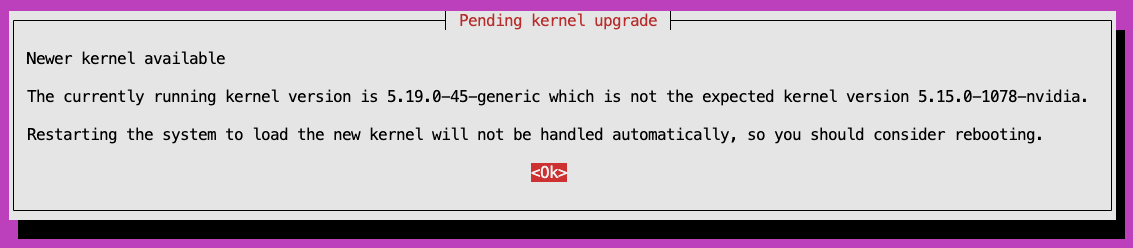 cm-chroot-sw-imgto update the DGX nodes image. Press <OK> if prompted for newer kernel is available. When all done, exit chroot.root@demeter-headnode-01:~# cm-chroot-sw-img /cm/images/dgx-os-6.3.2-h100-image/ root@dgx-os-6:/# apt update root@dgx-os-6:/# apt list --installed | grep slurm WARNING: apt does not have a stable CLI interface. Use with caution in scripts. slurm23.02-client/BCM 10.0,now 23.02.6-100806-cm10.0-9c8dc03511 amd64 [installed,upgradable to: 23.02.8-100881-cm10.0-48e305b89c] root@dgx-os-6:/# apt install slurm23.02-client root@dgx-os-6:/# apt list --installed | grep slurm WARNING: apt does not have a stable CLI interface. Use with caution in scripts. slurm23.02-client/BCM 10.0,now 23.02.8-100881-cm10.0-48e305b89c amd64 [installed] root@dgx-os-6:/# exit