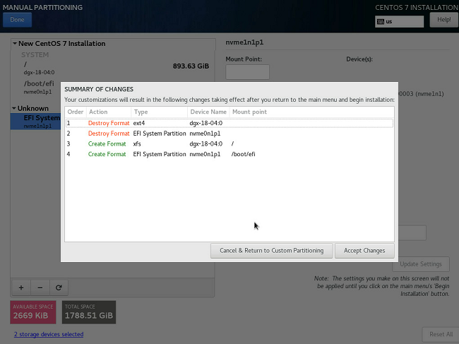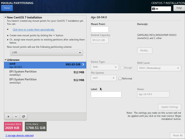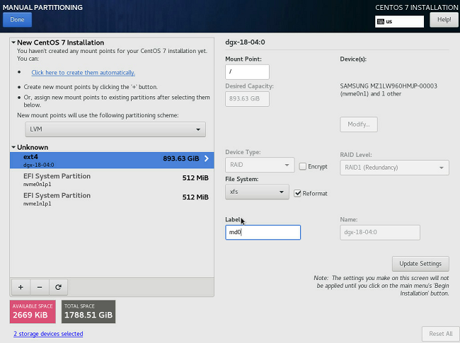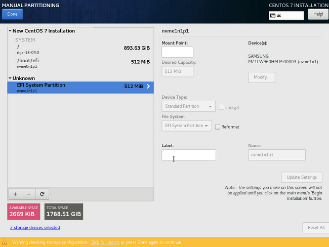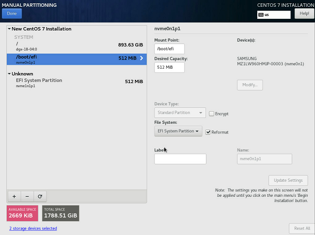 - Select the second EFI partition, in the Unknown section (nvme2n1p1 on DGX A100), reformat it as an EFI System Partition, then set the mount point to "/boot/efi" and click Update Settings. At this point, the two partitions you configured will be under the New CentOS Installation drop down menu, and the Ubuntu EFI partition (nvme3n1p1 on DGX A100) will be under Ubuntu. We can't create a second ESP because CentOS won't allow you to create two partitions mounted on the same mount point, i.e. /boot/efi, even if they are on different disks. You can replicate the ESP after installing the "DGX System Management" yum group, which provides a tool to accomplish this.