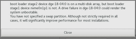 The message appears because the DGX OS from the factory has created a RAID 1 array for the root partition, and has replicated the EFI system partitions. - Close the warning and then press Done.
