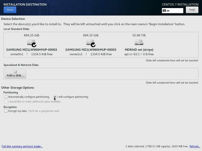 - At the Installation Destination screen, select both M.2 disks (i.e. the 894.25 GB ones) and