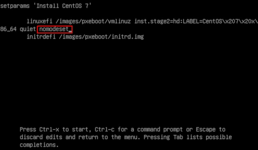 On the DGX Station: Update the linuxefi parameters to prevent the Nouveau driver in CentOS from being loaded and then start the installation.