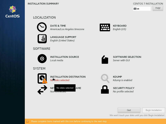 There should no longer be a yellow warning icon on the System: Installation Destination option.