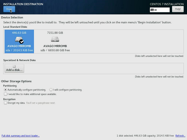 - At the Installation Destination screen, select the first drive (sda) as the installation drive.