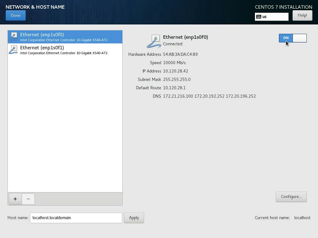Select and enable the Ethernet device. This defaults to DHCP and can be changed for static IP configurations under Configure. This screen also lets you set the hostname.