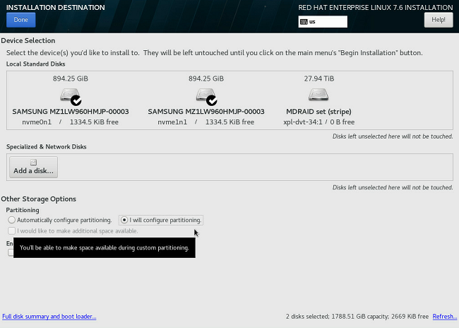At the Installation Destination screen, select both M.2 (894.25 GB on DGX-2 or 1788 GB on DGX A100) disks, the "Automatically configure partitioning" radio button and the I would like to make additional space available check box, then click Done.