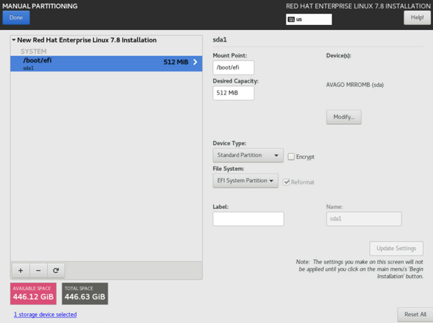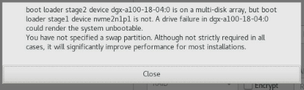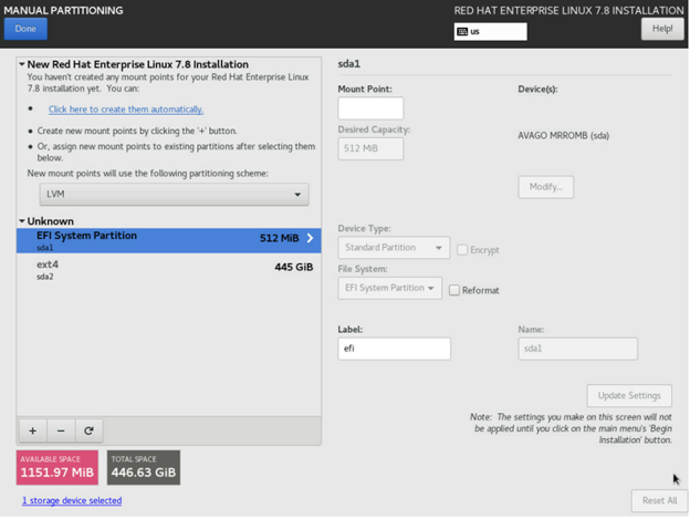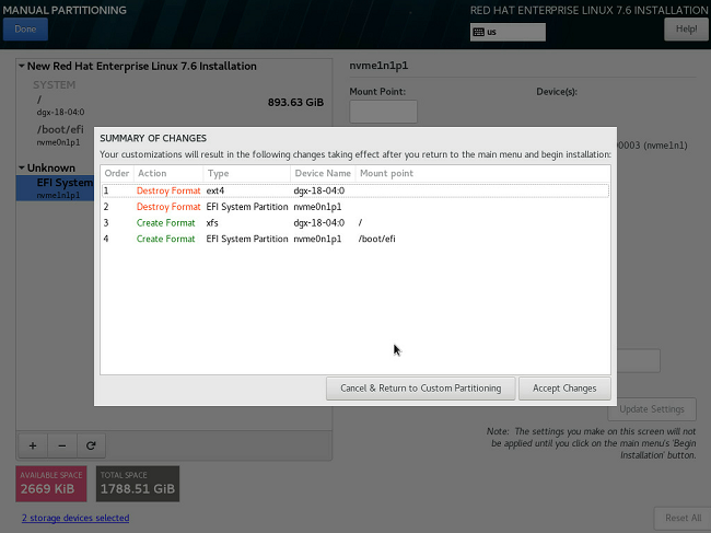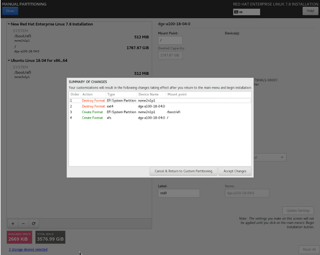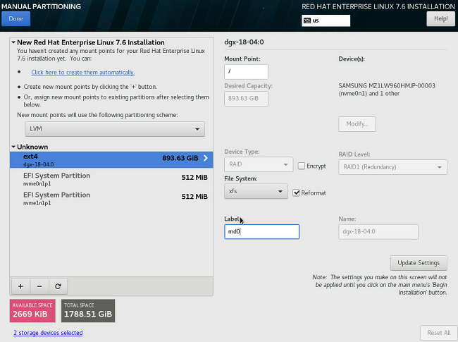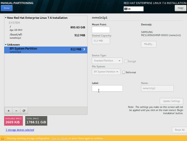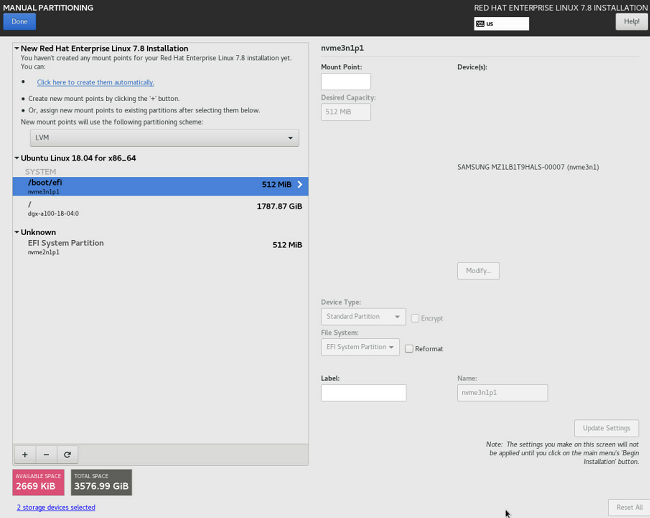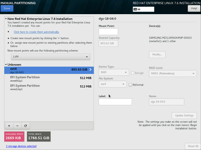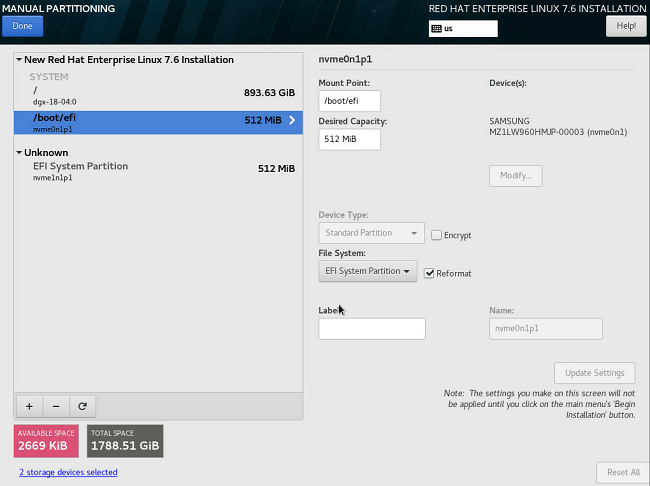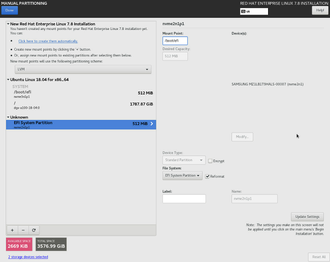 At this point, the two partitions you configured will be under the New Red Hat Enterprise Linux Installation drop down menu, and the nvme1n1p1 EFI partition will still be in Unknown.  We can't create a second ESP because Red Hat Enterprise Linux won't allow you to create two partitions mounted on the same mount point, i.e. /boot/efi, even if they are on different disks. You can replicate the ESP after installing the "DGX System Management" yum group, which provides a tool to accomplish this.