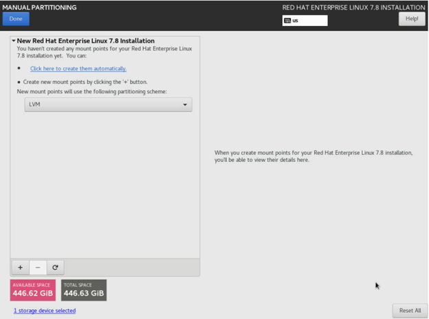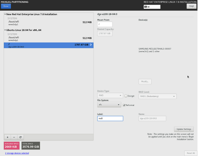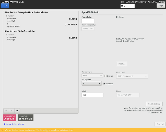 2. At the Installation Destination screen, select both M.2 disks (i.e. 1788 GiB on DGX A100) and the "I will configure partitioning" radio button, then click Done.