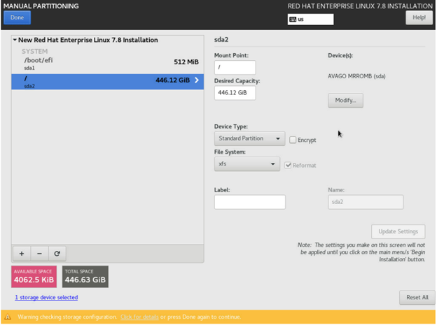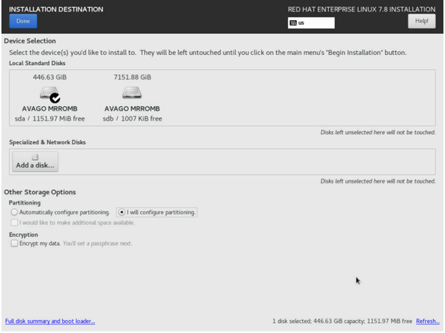 2. At the Installation Destination screen, select the first drive (sda) as the installation drive.