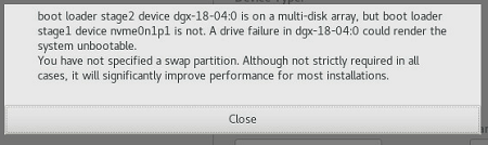 The message appears because the DGX OS from the factory has created a RAID 1 array for the root partition, and has replicated the EFI system partitions.