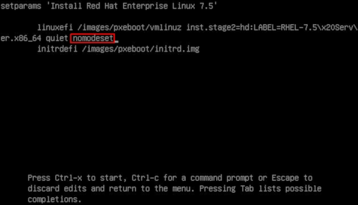 • On the DGX Station: Update the linuxefi parameters to prevent the Nouveau driver in Red Hat Enterprise Linux from being loaded and then start the installation.
