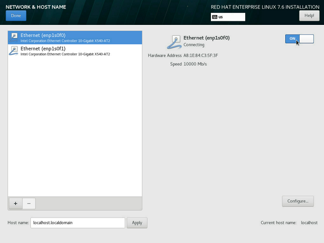Select and enable the Ethernet device. This defaults to DHCP and can be changed for static IP configurations under Configure. This screen also lets you set the hostname.