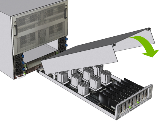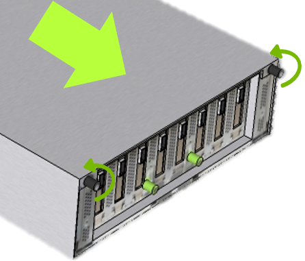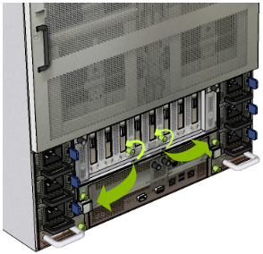 1. Loosen the two green I/O tray screws with a Philips #2 screwdriver and pull the levers outward to release the tray.