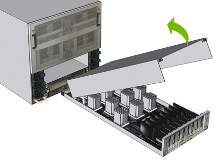 4. Remove the I/O tray, place on a solid, flat surface, and then open the lid.