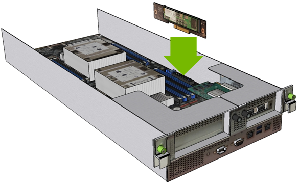 - Install the assembled module on the motherboard by inserting the the riser card in its slot.