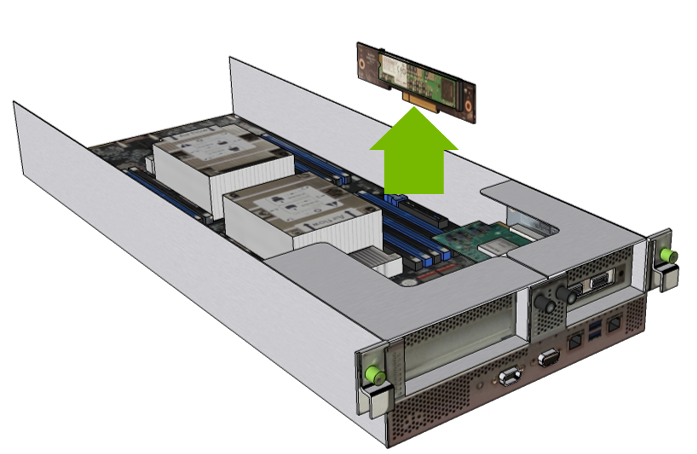 - Remove the M.2 modules and the riser card from the motherboard tray by pushing on the clip to release the riser.