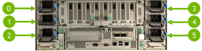 Both NVSM and the BMC identify each power supply as PSUx, where x is from 0 to 5. The following diagram shows the physical location of each PSU.