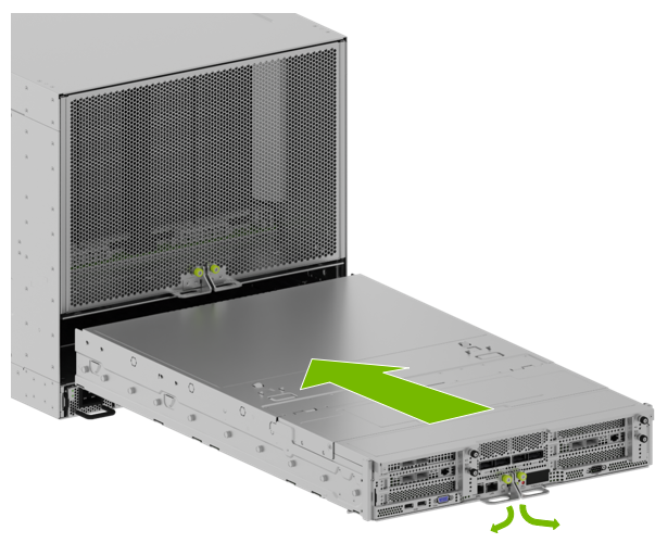 After the levers are flush against the tray, confirm they lock securely onto the motherboard tray hooks.