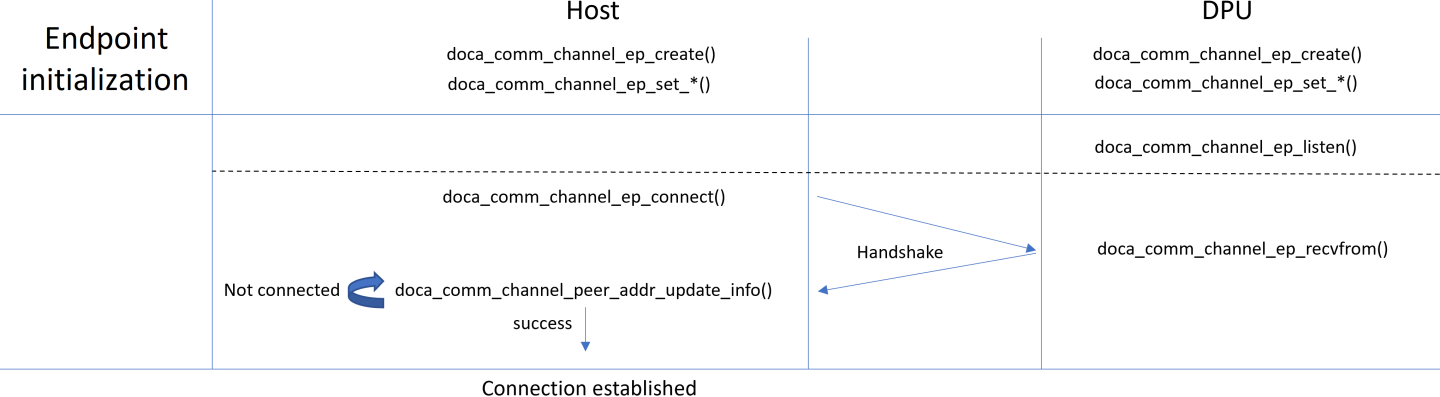 The Comm Channel connection is established between endpoints, one on the host and the other on the DPU.