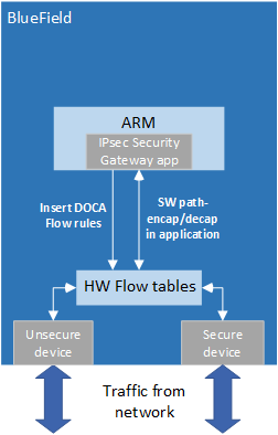 DOCA IPsec Security Gateway leverages the DPU's hardware capability for secure network communication. The application demonstrates how to insert rules related to IPsec encryption and decryption based on the DOCA Flow and DOCA IPsec libraries.