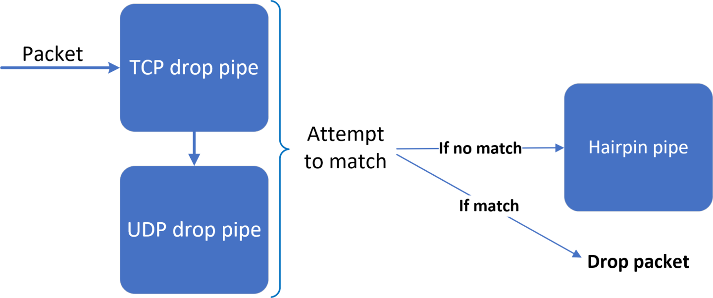 - The drop pipes match only 5-tuple traffic with specific source and destination IPs and source and destination ports. One of the drop pipes matches TCP traffic and the other matches UDP. The hairpin pipe matches every packet (no misses). The drop pipes serve as root pipes and the hairpin pipe serves as a forwarding miss component to the drop pipe. Therefore, every received packet is checked first against the drop pipes. If there is a match, then it is dropped, otherwise, it is forwarded to the hairpin pipe and is then matched.