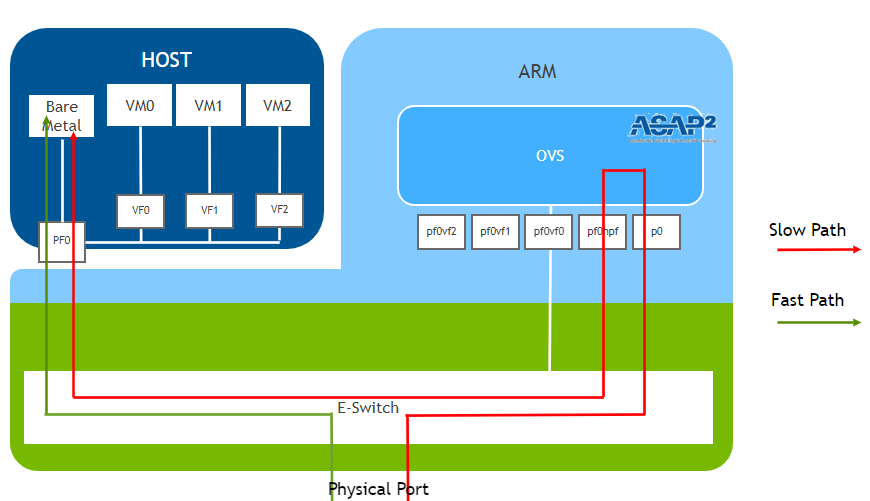 pf0hpfis associated withpf0on the host. The packet is sent frompf0hpfon the Arm topf0on the host. - The host processes the packet and responds with a packet to the Arm. OVS learns the packet and adds a rule into OVS table. Now ASAP2 adds the same rule to the e-switch.