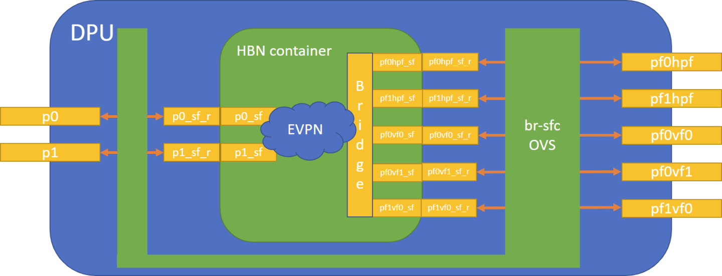 The indirection layer between the SF and the actual ports is managed via a br-sfc OVS bridge automatically configured when the BFB image is installed on the DPU with HBN enabled. This indirection layer allows other services to be chained to existing SFs and provide additional functionality to transit traffic.