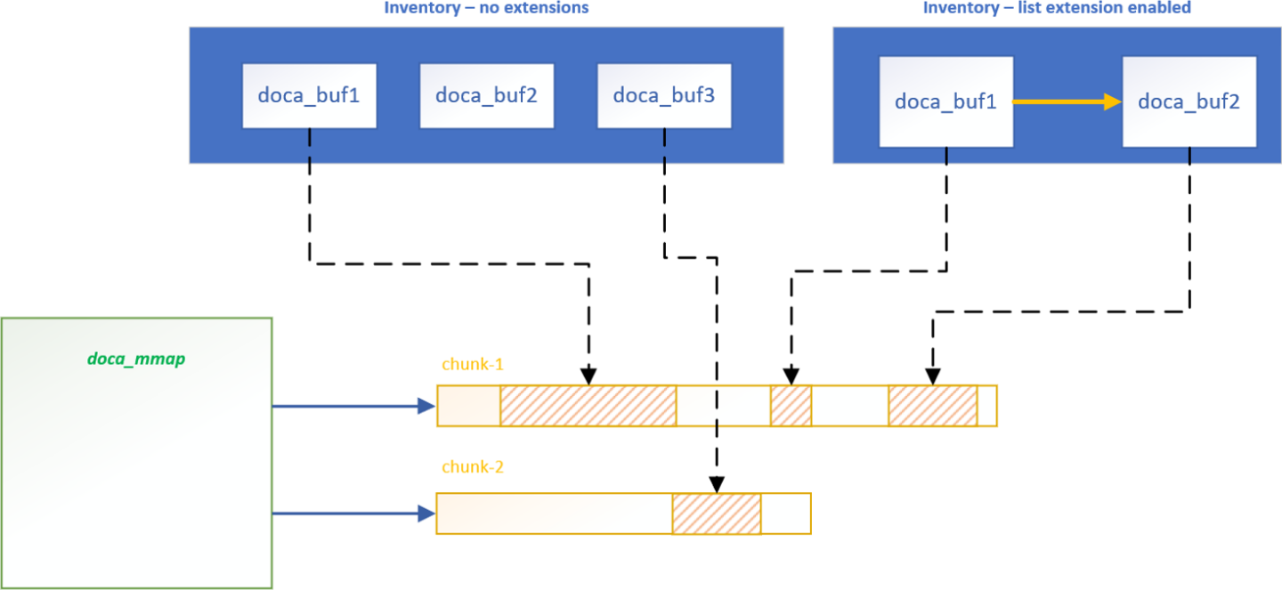 LINKED_LISTextension which allows chaining severaldoca_bufs in a linked-list manner) an application can check if the list extension is supported bydoca_buf_inventorywith:doca_error_t doca_buf_inventory_get_list_supported(struct doca_buf_inventory *inventory, uint8_t *list_supported);