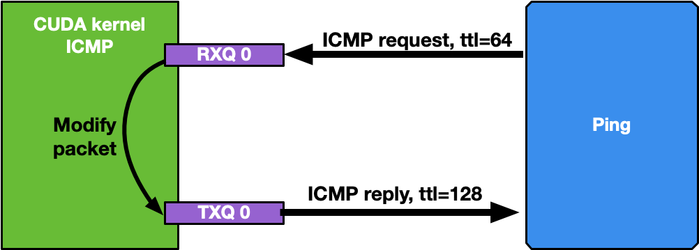 If the network interface used for the application has an IP address, it is possible to ping that interface. ICMP packets are received by a dedicated CUDA kernel (file gpu_kernels/receive_icmp.cu) which: