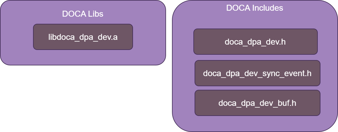 DPACC is used to compile and link kernels with DOCA DPA device libraries to get DPA applications that can be loaded from the host program to execute on the DPA (similar to CUDA usage with NVCC). For more information on DPACC, refer to the DOCA DPACC Compiler.