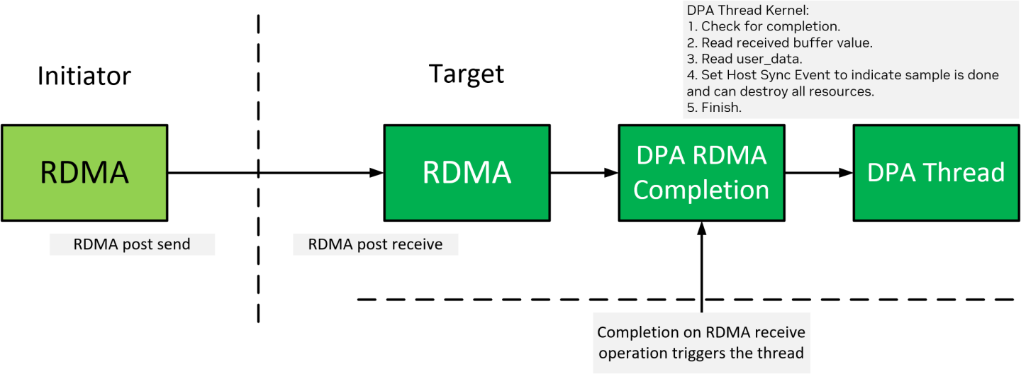 Once all expected values are received on each DPA thread, it sets a DOCA Sync Event to release the host application waiting on that event before destroying all resources and finishes.