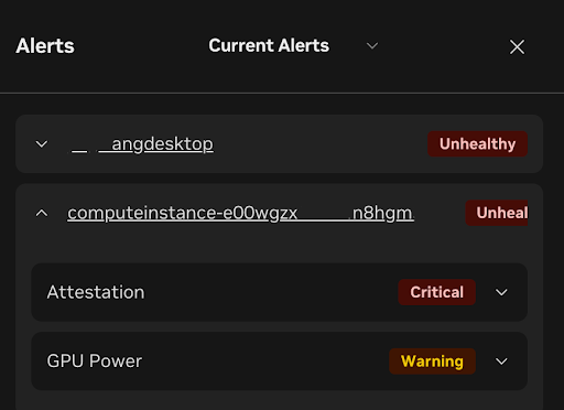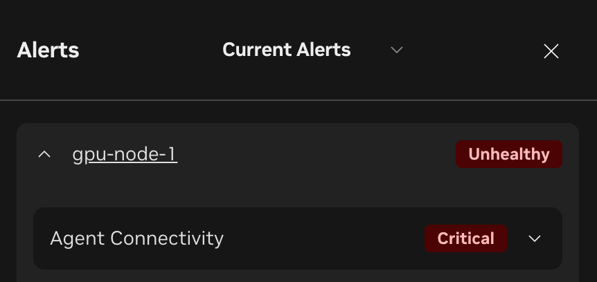 The Total Alerts panel “View all” button and the “Alerts” button in the header will take you to a quick summary of all ‘active’ alerts in your GPU fleet. Shown below, you can see alerts are grouped by nodes in this view and can be expanded to show the type of alert for each host.