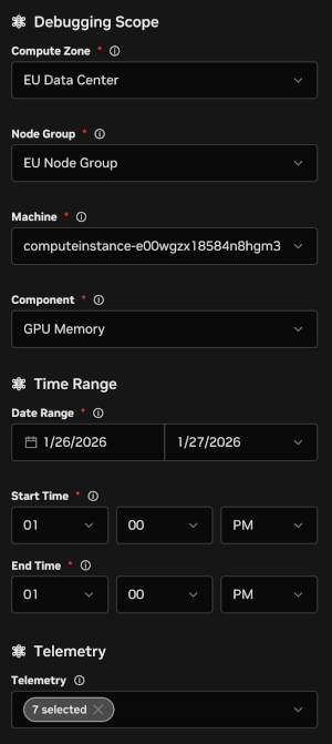 In the “Debugging” tab you can use the “Debugging Scope” selection (Filter) on the left to select a single node from which to get detailed telemetry. Furthermore, you must select an individual component group of telemetry and a time range. Within the component group you can select multiple telemetry metrics to show on a single screen.