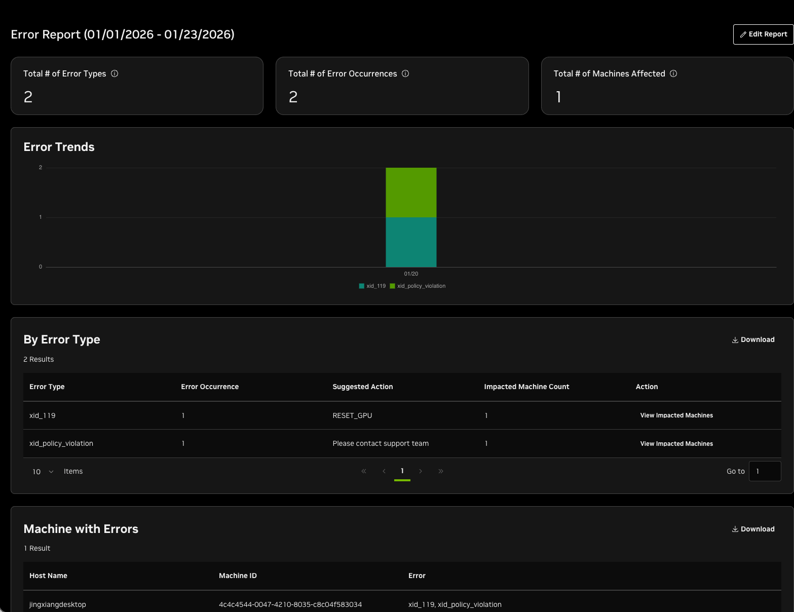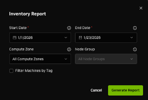 Under the “Reports” tab you will find available reports to run about your inventory and errors reported within your fleet. Selecting a report will provide you with the ability to select a time range, Compute Zone, and Node Group, along with a “Filter Machines by Tag” option. Node Group and Compute Zone are optional filters; machines can also be filtered by Tag.