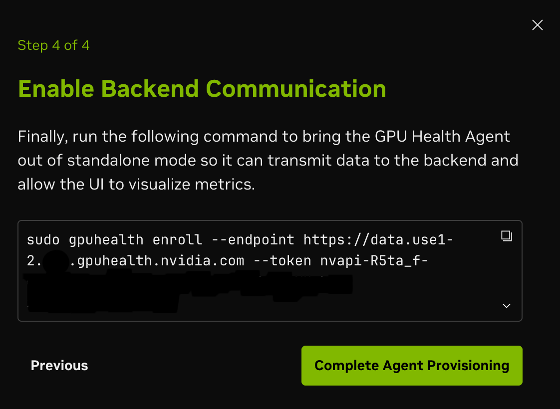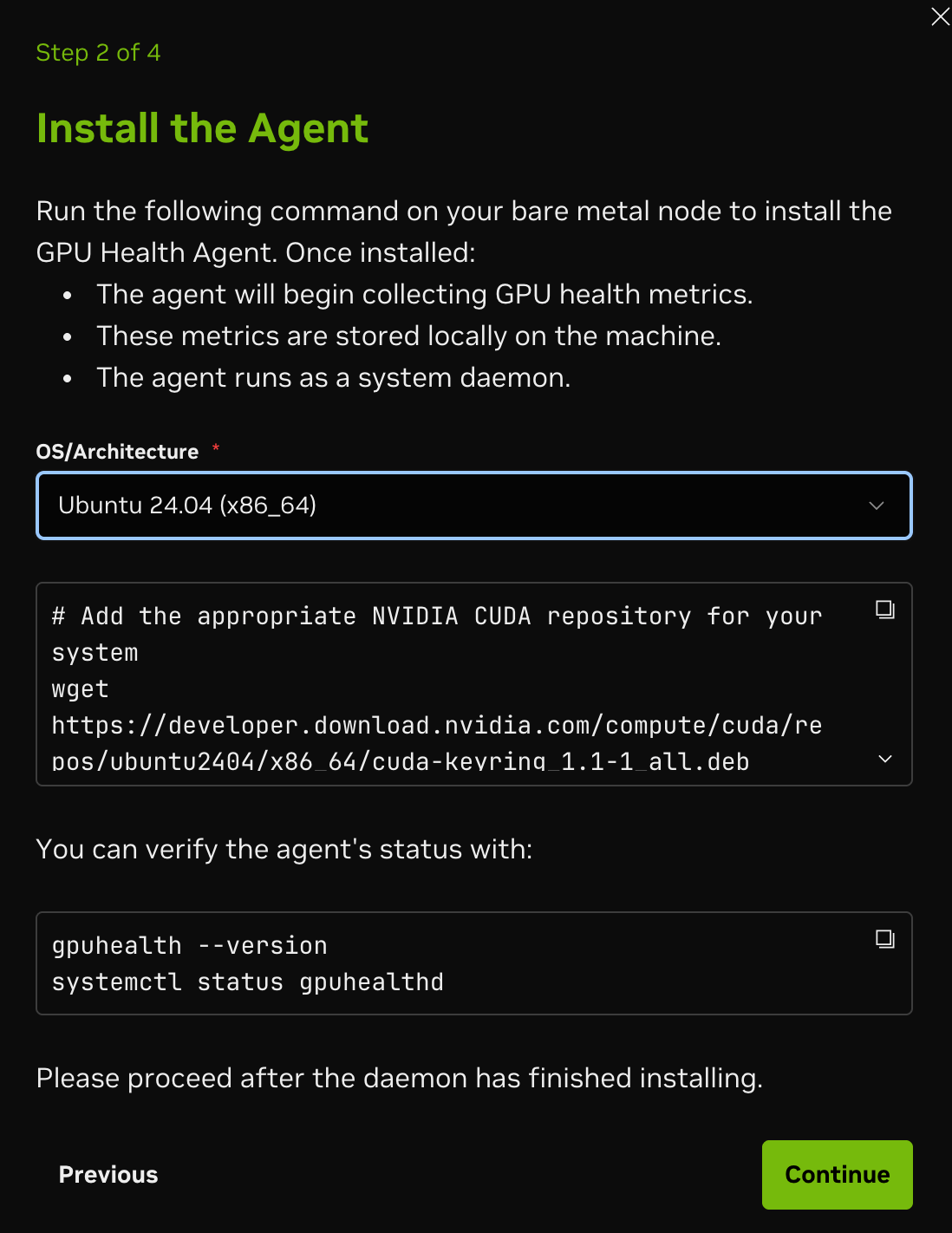 After you download the agent, the commands to install the agent will be presented for a number of operating systems (for example, Ubuntu and Red Hat derivatives), including adding the CUDA repository to your system for the DCGM installation if needed (if the NVIDIA Data Center GPU Manager (DCGM) repository is added, the Fleet Intelligence agent installation will include it as a dependency).