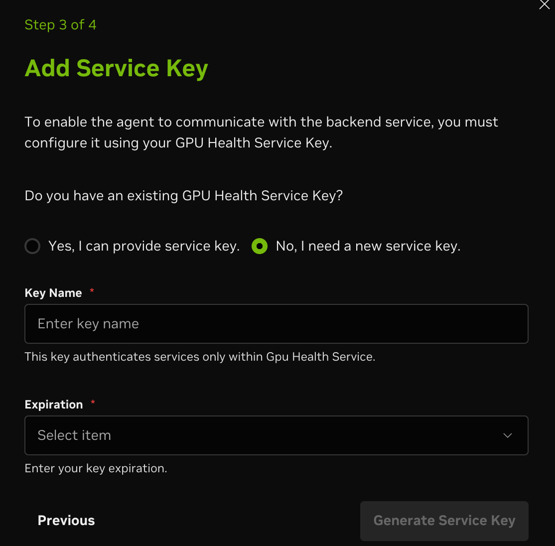 In step 3, create a new Fleet Intelligence service key, or reuse an existing, unexpired key. If generating a new key, choose the validity period and click Next. The key will be displayed for you to copy.