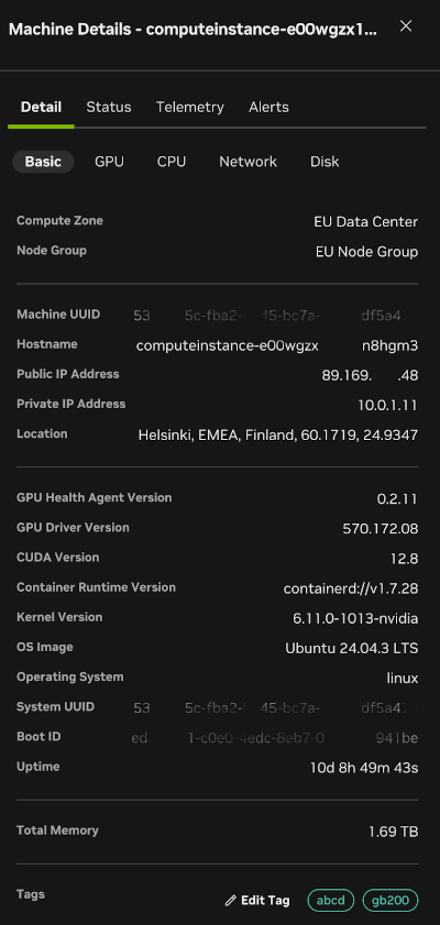In any of the inventory panels, upon clicking on a machine’s host name, a side panel will appear on the right and present details about the state of the machine. There are four tabs on this panel. The Detail tab presents metadata about the machine, including the Fleet Intelligence agent, GPU driver, CUDA, kernel, and OS versions. Sub-tabs of the Detail tab (not shown) provide collected metadata information about GPU, CPU, Network and Disk.