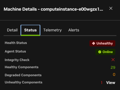 The Status tab provides a brief summary of the status of major components and provides the integrity check of the GPU along with an overall status for the node.