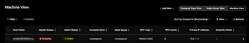 Once the agent initializes, it should take about one to five minutes for the node information to appear in the Inventory -> Machine View list. The Compute Zones and Node Groups will appear as Unassigned (see below). Use the next section to create groups and assign your agents.