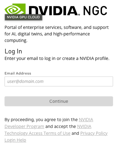 Navigate to the link provided for the Fleet Intelligence dashboard. After you arrive at the dashboard, you will be prompted to log in with NVIDIA GPU Cloud (NGC), as shown below.